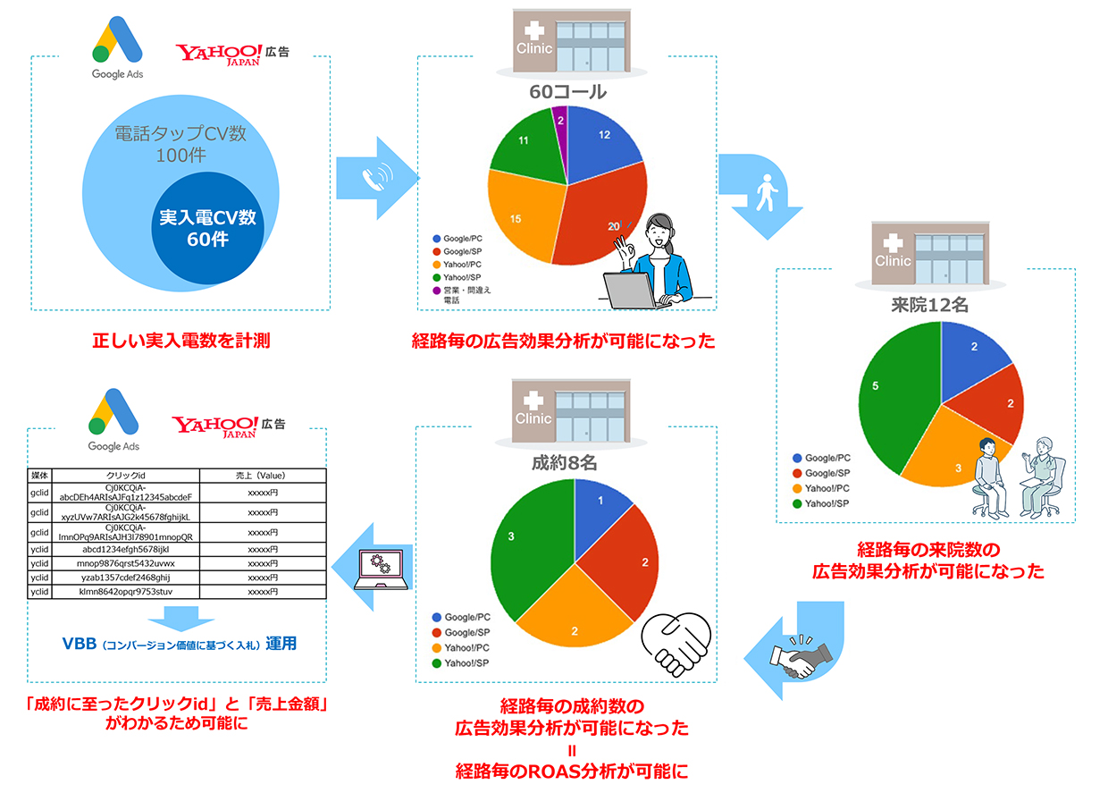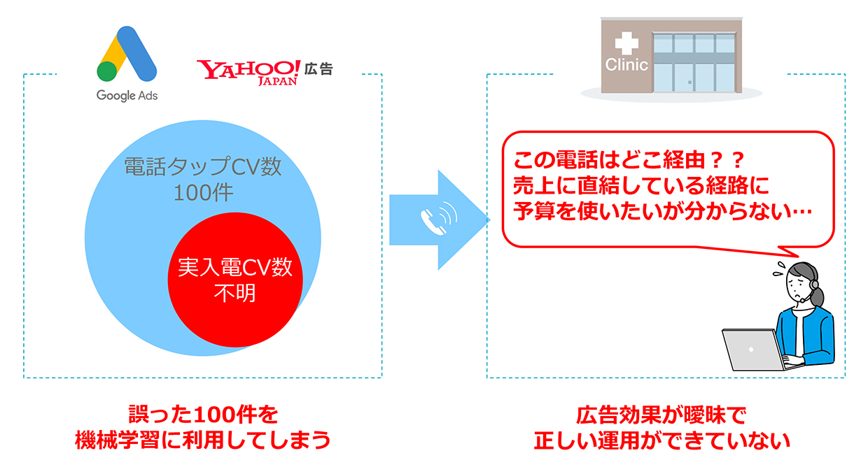 具体的には、LP上で電話番号をタップしても通話につながらないケースと、実際に通電し予約に至るケースの区別ができず、通常のコンバージョントラッキングでは十分な分析ができませんでした。医療機関では電話による問い合わせ・予約が多いため、広告経由での通電を正しく計測することが広告効果の最大化に不可欠でした。